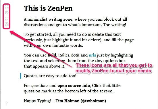 Make ZenPen go fullscreen: The first icon lets you toggle ZenPen’s fullscreen mode on or off. What this essentially does is make the browser window that you’re using ZenPen in go fullscreen. And I must say, all of that whitespace with no distractions will make minimalism lovers even more happy. Check out the screenshot below: