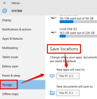 Step 2: System menu has multiple sub menus. You need to access Storage sub-menu. This menu has options to change Save locations for new apps, documents, music, etc. You need to change Save location for new apps, which is set to This PC (C:) by default.