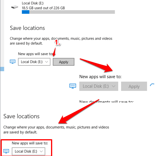 Step 3: Click on drop-down icon and it will show other drives. Select a particular drive, Apply changes, and that’s it! It will quickly set new drive as default storage location for new apps.