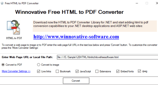 Winnovative Free HTML to PDF Converter is another very simple but useful software. This software lets you convert a webpage or HTML file to PDF (one file at a time) on your Windows 10 PC. You need to enter the URL of local file or webpage and then you begin the conversion. The output PDF is opened automatically after conversion in your default PDF reader. One unique feature comes with this software is you can convert webpage or HTML file to JPEG, BMP, GIF, PNG, and TIFF image. So, it can also be used as free webpage or HTML to image converter.