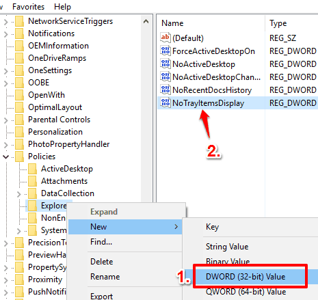 Step 3: Under this Explorer key, create a new DWORD (32-bit) Value and rename it with “NoTrayItemsDisplay“.