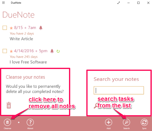 To remove all completed tasks, just use the option of “Cleanse”. This will delete all the completed tasks, without a need to delete them one by one. It also has an option to search tasks. This is helpful if you end up having too many tasks.