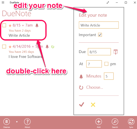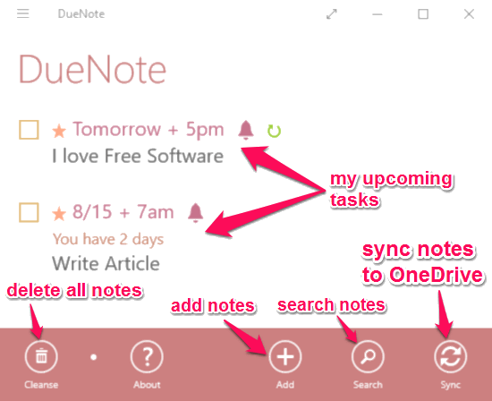 DueNote is a simple note taking app for Windows 10 that lets you add reminders to the notes, and shows the notes on Live Tiles. And your notes are shown ordered by dates on which they are due (the ones which do not have any due date set are shown due as today). This app also lets you set recurring reminders with the notes. In addition to that, you can sync your notes with OneDrive, so that your notes are available on all your devices. In addition to Windows 10, DueNote is compatible with Windows 8 as well.