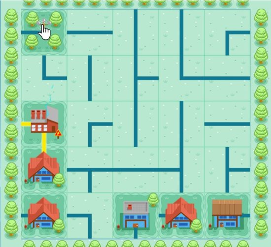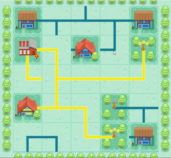 The game board has various houses, a power house and lots of connector lines. You have to connect the lines from the power house to individual houses so they can have electricity. You have to use all the lines and cover all the blocks as well to proceed to the next level. The connections which are made properly will light up the houses and the connected lines will also light up in yellow color. This can be seen in the screenshot below.