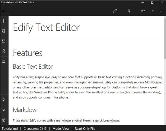 Edify Text Editor is a Windows 10 plain text editor app which can be used to replace apps like Notepad. If your device does not have a built in text editor then you can easily download and use this app in place. The app has some very good features like live markdown editor, auto saving of files, file syncing, distraction free writing, etc.
