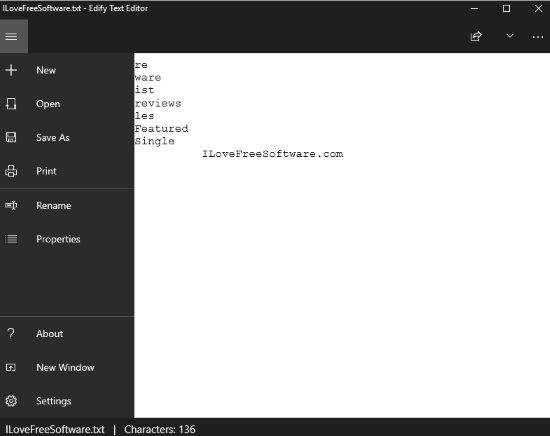 The left side menu has the option to create a new file, open a existing file, save a file, print a file, rename a file, etc. The new file you create will have a blank interface with no options to confuse you. You will get a minimal environment so you can write in a distraction free way. The file has a auto save feature and you can see the word count at the bottom of the window.