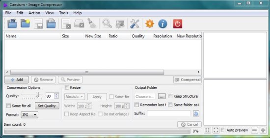 Caesium comes with a simple, rectangular interface that lists some useful tools on the top, a blank area to list image files below the toolbar, a preview window on the right side, and a settings panel at the bottom listing options for image compression, resizing, and output directory.