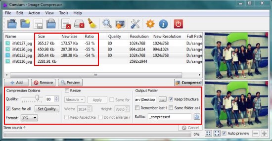Caesium displays the original file name, file size, and resolution of every listed image before you apply compression on them. You can preview how the image will look (for quality comparison) by choosing an image file and pressing “Preview” button.