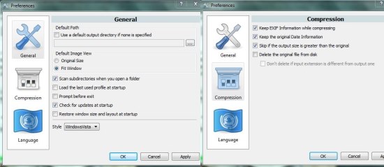Caesium also provide some setting options to specify the default output directory, default image view, change program layout, keep EXIF data and date information while compressing images, delete original images from disk, etc. You can access these settings by pressing the “Settings” icon from the top panel.