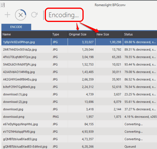 Above you can see the conversion process and original and new size of images when converting from JPG to BPG.