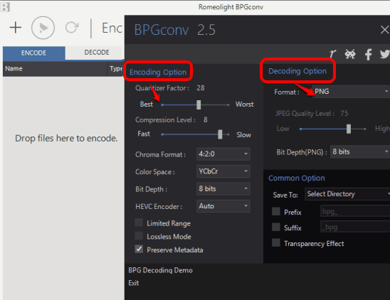 In a similar way, when you have to convert BPG to JPG, TIFF, BMP, or PNG, you can use the DECODE tab.