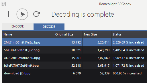 Use the ENCODE tab to add multiple JPG or PNG images and start the conversion to generate the BPG format images. You can also see the total decreased size for every single image.