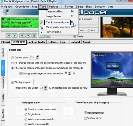 BioniX Desktop Wallpaper Changer provides variety of tools like enhance, smart size, wallpaper style, tile effects, automatic background color, overlay, auto detect dual monitor, and more. It shows which wallpaper is being displayed and what is the time duration. It is fun to use this application. Time controller has seconds, minutes or hours option where you can also select time interval for each of the wallpaper to display on desktop automatically.