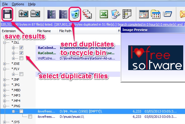 Once the scan will be completed, results window will open up. Here, duplicate files will be available extension wise. For example, *.exe extension will contain all the duplicated executable files. Image preview (if enabled) for duplicate images will also be visible to you. Now from the results window, you can select unwanted duplicate files to either send them to recycle bin or to move them to another folder.