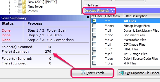 Bottom middle part of its interface lets you select file filters and to begin search process. File filters are used to start search based on selected file extensions. For example, if *.gif/*.png/ *.jp/*.tiff extensions are applied, then search result will provide you only duplicate images from input folders/drive. Multiple preset file filters are available to choose from. You can even edit any available filter or can add a new filter. If you want to find all kind of duplicate items, then don’t choose any particular file filter.