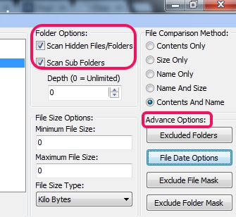 At top right part on its interface, these options will be visible to you. As mentioned earlier, there are five separate comparison methods available, which you can choose from. These are: contents only, size only (to find duplicates based on same size), name only, name and size, and contents & name. Based on the selected method, search process will begin.