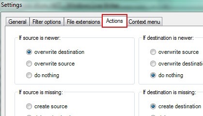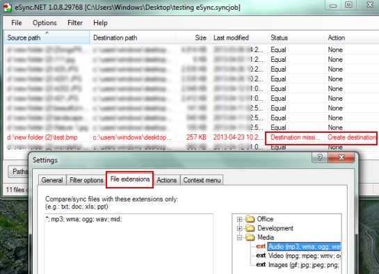 - Settings: This is one of the main option of eSync.NET. Using settings option, you can add specific extensions for comparing and syncing files. Moreover, you can also choose the desired action from available actions in case source or destination file is missing. For example, if there is source file missing, but that file is available in destination path, then you can select the option of ‘Create source’. By doing this, same file will be available in source and destination folder after synchronization.