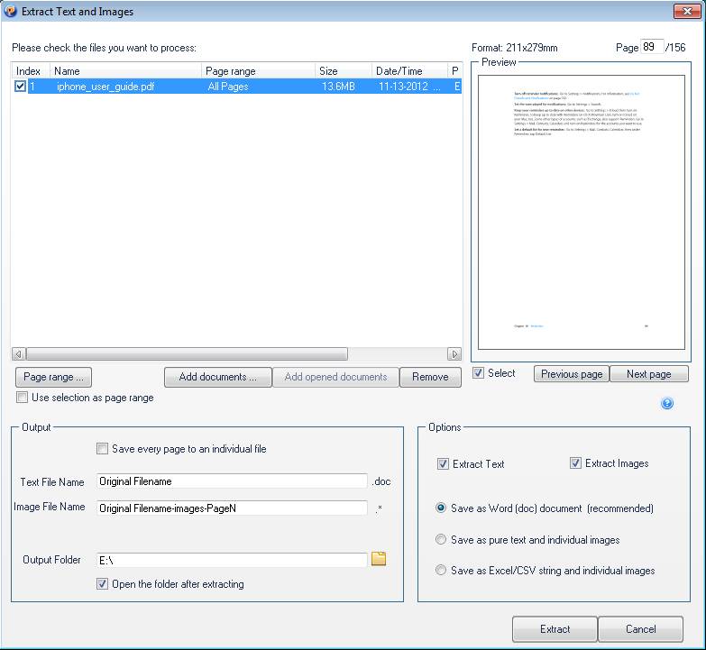 Extracting images and text is available by selecting Convert >> Extract Images and Text. You should see the window which can be seen in the image above. Select the extraction options down below, separate sections are available for images and text. By clicking on Extract button the extraction process will begin. In this way, you can extract images and text from your documents.