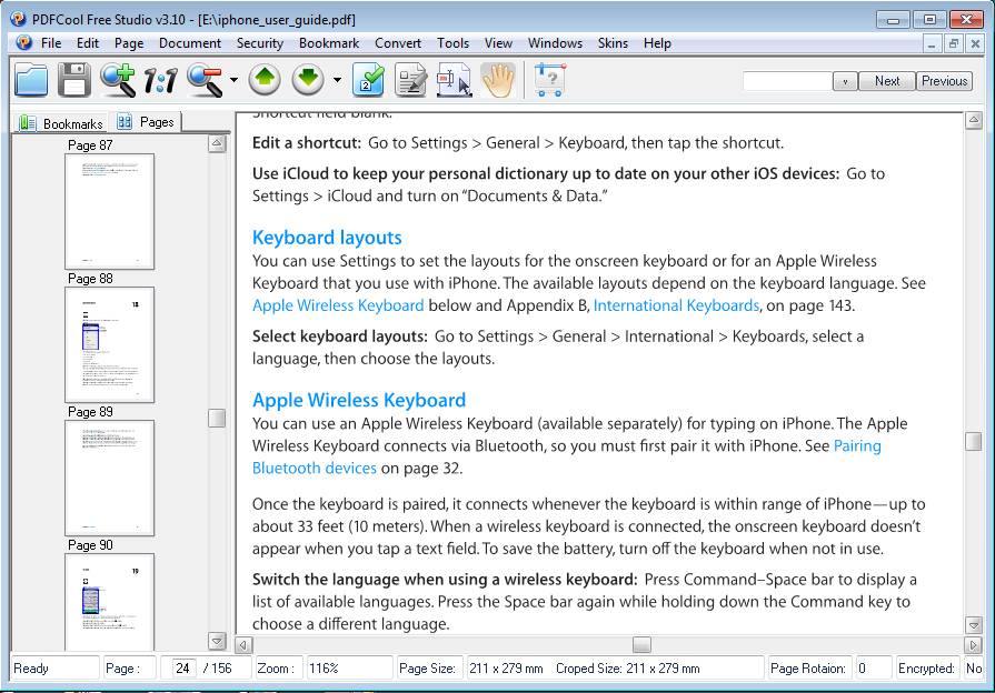 In the image above you can see this PDF management software’s interface with a document already opened. On the right side of the windows PDF files are gonna be opened. Left sidebar can either have all the pages of the document listed or you can there have page bookmarks for quick access to bookmarked pages. Top of the window is reserved for the very large list of PDF editing tools that PDFCool has to offer.