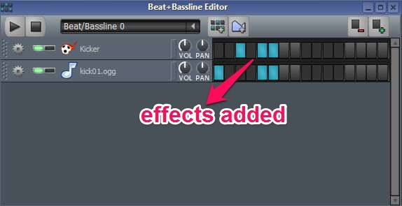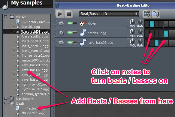 Step 3: Add Beat / Bassline: Let’s jazz up our song by adding some beats to it. For that, we will use the third option of Beat / Bassline. When you double click anywhere on this, it will open Beat / Bassline editor on the right side. In this, start by adding some beats or basses from the samples available on extreme Left side of LMMS. Once you have added some, you can just click on the bars in front of them to enable /disable a particular beat / bassline for a particular note. Again, use play button to listen to how the things are turning out. Once done, close the window.