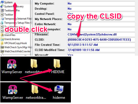 Once we’re in the command prompt, we can simply rename the file with the CLASSID of any of the extension. In this example we would choose “system” shell extension from the list and double-click on this item to view the CLSID. Now we would go in to the command prompt to rename the folder you want to hide. Change the directory to the directory where the target folder resides by using the “cd” command to change the folder. This is how we do it: