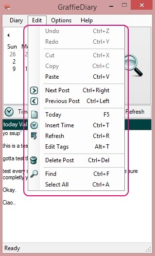 Entering posts and maintaining them is very easy. All you have to do is select the desired date and then, start entering the post in the lower pane. Give a suitable title and then enter your post. You can insert time in your post. Simply click on Time button to do so. There’s no limit to the number of words, that you can enter in a post. You can also use the customary cut, copy, paste functions and some other shortcuts like, jumping back and forth between saved posts, jump directly to current system day, insert time, and refresh options for creating post quickly. You can access these options from the Edit menu. Good thing is, you can also use the hot keys for these, and they are easy learn.