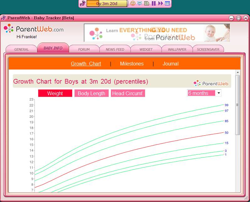 In the image above you can see the widget in action above the main window. There you can also see growth chart for your baby, the size that it should have as it develops.