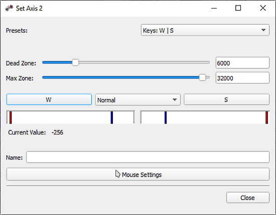 With the axis mapping options, you can map the keys and axis for analog buttons. Simply tap an axis button from the program and it opens a configuration pop-up along with some preset. You can try the presets first, if that doesn’t work out well, you can configure the key yourself.