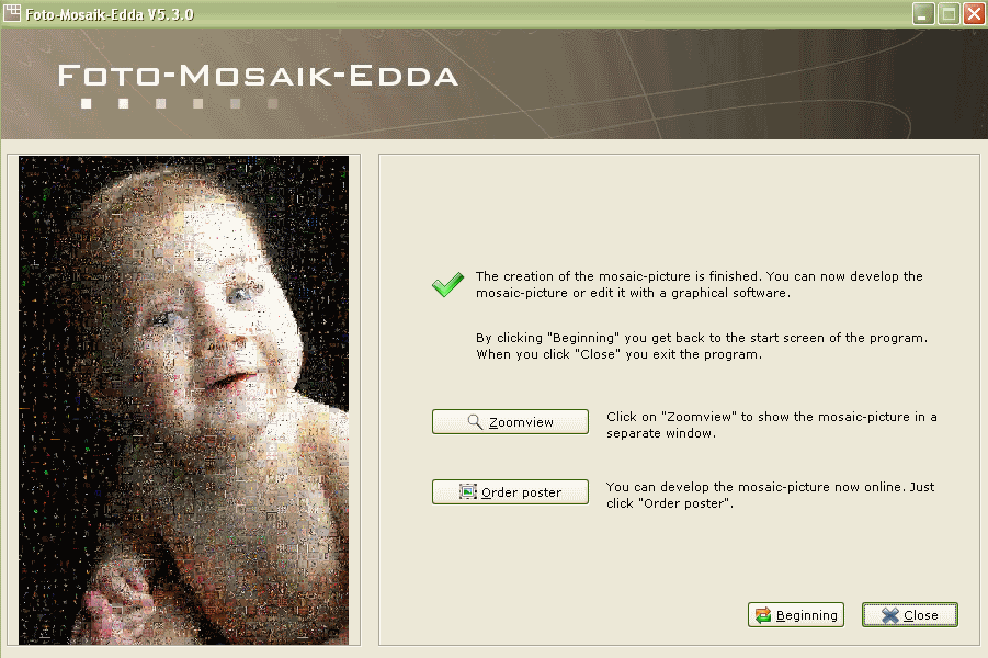 Foto-Mosaik-Edda completely automates this complicated process of making pictures. Essentially, only thing that you have to do is to supply the pictures, and Foto-Mosaik-Edda takes care of the rest.