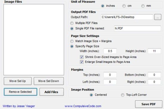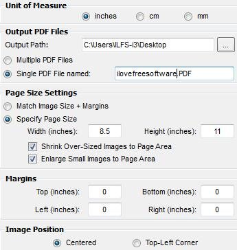 Step 7: Use Output PDF Files section to specify the output path, if you select Multiple PDF Files the every image will be converted to separate PDF file, and if you select Single PDF File named option then you can specify the out PDF file name; where all the images will be converted to single PDF file.