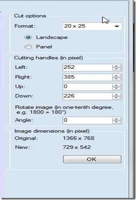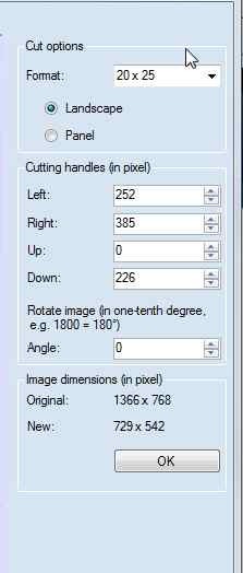 Here, you will find cut options on top. From the dropdown you can choose the various dimensions to cut the image. Here, 20 X 25 is selected. You can also change the dimensions manually under Cutting handles options available. Using mouse also the cutting can be done, the respective dimensions will be shown under Cutting handles. While trimming the original and new dimensions of the screenshot are also shown. Here, you can also rotate the image in any degree.