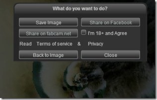 Keep adding effects, textures of your choice until you not satisfied with the changes. And once you are happy with your applied changes, you can easily save or share your that specific image using given button for this. As you could see in the below mentioned screenshot, you can easily save image to the desired location on your system by clicking on the Save Image button. Moreover, for sharing your image on Facebook or fabcam.net, use given buttons for it.