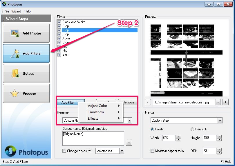 This Photopus software editor comes with a very attractive interface. The software follows a four step procedure. All the steps are mentioned in a chronological order, on the left side of the interface. First you add the picture, then add filters to it, select the location and finally hit the process button. The interface also displays the preview of the picture on the right side.