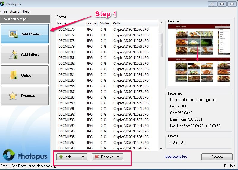 The first step, as soon as you open the software, is to add photos that you want to edit. All the photos that you select appear in a list in the centre of the interface. You can also add the entire folder at once. However, the free version of the software will only accept pictures that are in JPG format. You will have to upgrade to the paid Pro version to add Pictures in other formats.