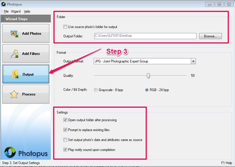 The third step of the procedure is to select the Output Folder where you wish to save the customized photo. The settings option under the Output tab allows you to select from options like automatically open the output folder after processing and many more.