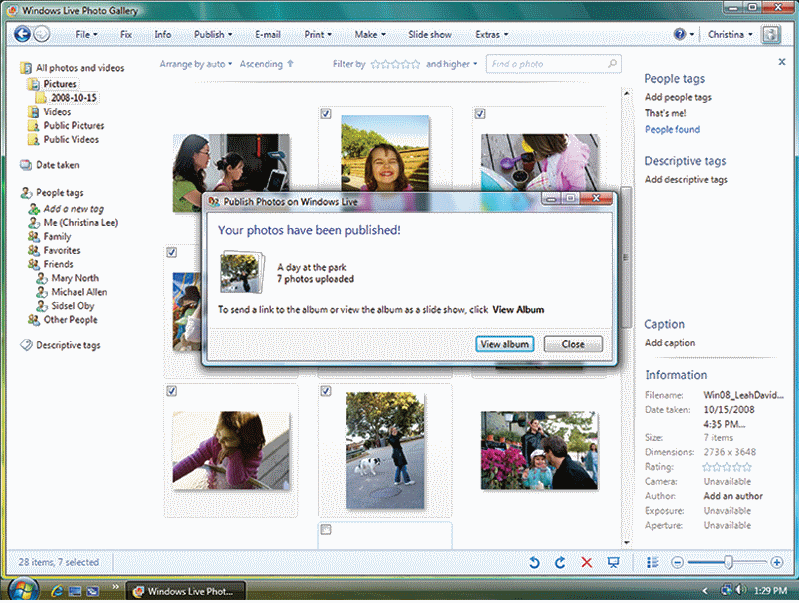 Windows Live Photo Gallery allows you to create online albums with your favorite pictures in it and share them with your friends via email. You can even control who sees your photos online by adjusting the settings.