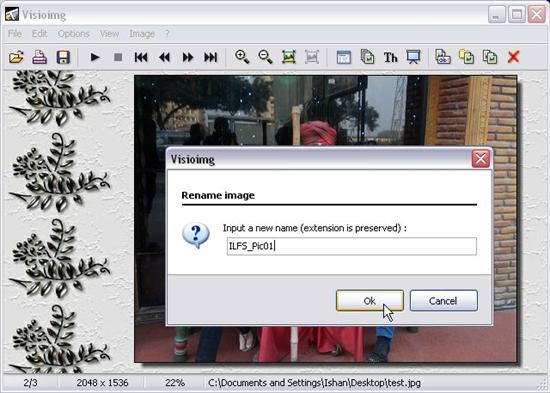 Another interesting feature of Visioimg is that it allows you to rename images from within itself (fourth icon from the right on the toolbar). Though you can rename images only one by one; batch renaming is not supported.