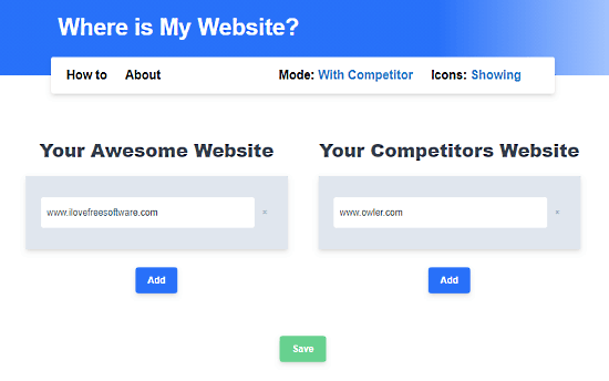 The Competitor Mode is to highlight both, your favorite and competitor websites. In this mode, you get two sections to add favorite and competitor websites. Enter the websites you want to highlight in the respective section. Only enter the domain name without HTTP or HTTLS and any slashes. This way, you can add as many websites as you want in both sections. After adding the websites, click the Save button to save the websites.