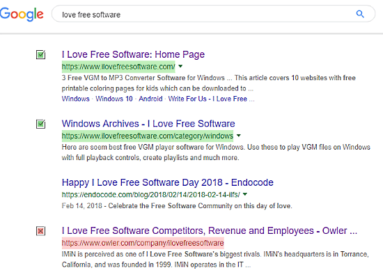 Here is an example of Competitor Mode. As you can see, it highlights the favorite websites with green color and competitor websites with red color. It also shows you an icon in front of each website which you can hide from the extension settings if you want.