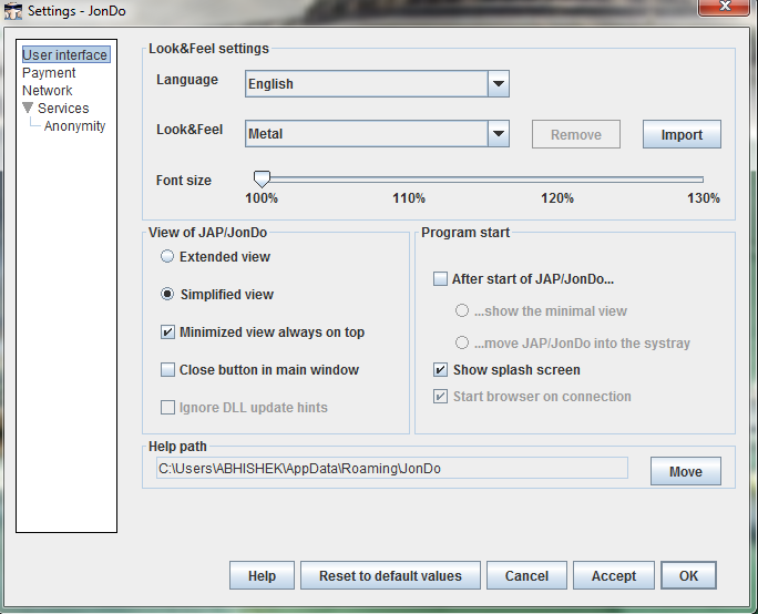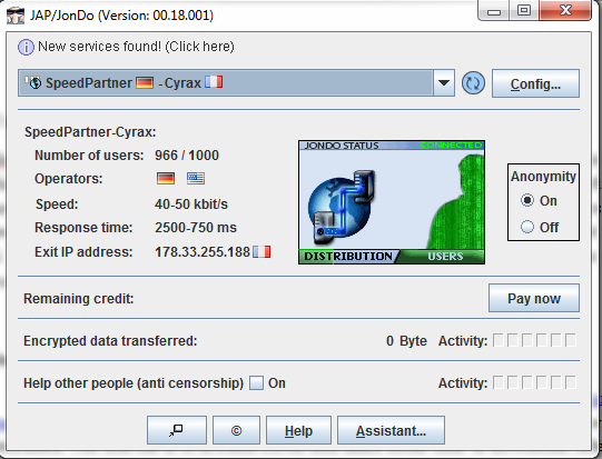 In the view jap/jondo option you can select the view that you like. Then there is the payment option that enables you to make payment if you are using a free version. In the network section you can select the type of network you have and set it up with your internet connection. There is an option in the main screen where you can put your anonymity on or off. All in all JonDoFox is complex software but good for the protection of your system while you use the internet.