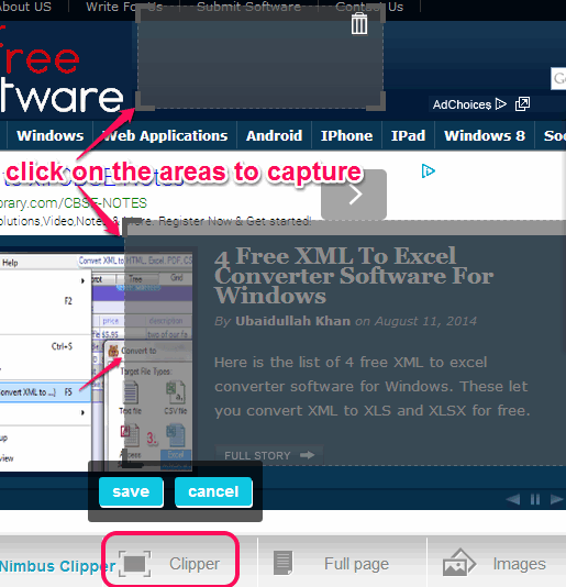 This option helps to capture different portions of a webpage. You simply have to click this option. After this, wherever you move mouse cursor, it will highlight the area that can be captured. Click on the required area(s) and it will be captured.