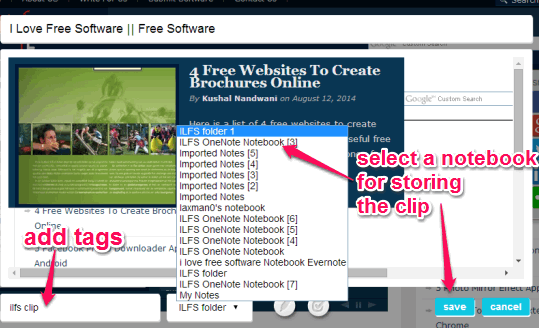 After this, you need to click on Save button. Immediately, edit box will be opened, just like visible in screenshot below. Here, you will be able to add required title, add custom text if necessary, and can add tags to that particular clip. Once you are done with editing, you need to select the Notebook available in your Nimbus account where you want to save that particular clip.