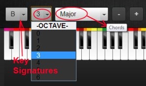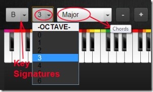 It is one of the easy to use app. Simply add this piano app on your Google Chrome with this given link. Go through this link and add it to your Chrome browser. Just after adding this useful app, open it from new tab. It will provide you its interface where you will find piano keys, key signatures, chords, octaves, and inversions (see the above given screenshot). Use them according to your easiness. Press keys with the help of mouse or else you can use keyboard too. Hold shift+press mouse to play a chord.
