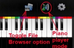 At the top right side of its interface, you will find piano player mode option. This option will let you select desired mode of this piano app (for color bars to fall either from downside up or from up to down). Just beside this player mode option, there is Toggle File Browser option present (see the below given screenshot). This option provides you bunch of music files available in it. You can play them or even download them. Just select a desired music to play.
