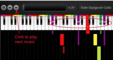 After selecting a specific music, it will start playing on this piano app. You can easily view the keys (A, B, C, G#, C# etc.) and falling colors from those keys. This way, you will remember which key is meant for which sound. For changing the music, use the available next or previous buttons.
