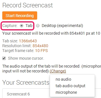 - Tab Option: Use this option if you want to record activities of a tab. Select this option, set tab size using preset sizes, frame rate for output video, and hit the Start Recording button. If you want, you can also record audio based on your requirement. A virtual mouse cursor is also displayed while recording the screen which also provides a click effect, whenever you will click. You can enable/disable mouse cursor as well.