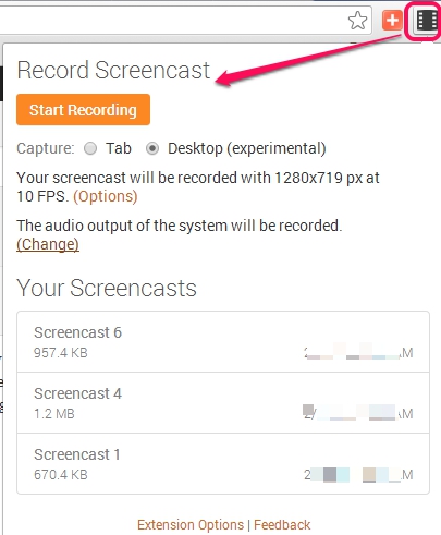 In above screenshot, extension icon of this screen video recorder is highlighted. Clicking on that icon opens a pop up window where you can use tab or desktop option to start recording screen.