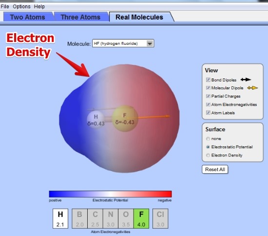 - Real Molecules: It is also an interesting option, as you can see the electron density around the structure of known molecule. You get lots of predefined molecules and you can see how the Electron Density, Atom Electronegativities, Partial Charge, Molecular Dipole, and Bond Dipole are spread around the molecule.