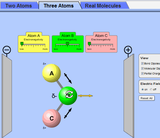 Molecule Polarity lets you change the electronegativity and position of the atoms inside a molecule to observe the change in the orientation of the overall molecule for the applied Electric Field.
