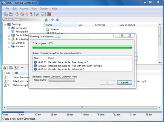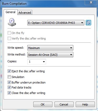 The program will then display a window from where you can change the settings of the current burning compilation. Once you are done, click Ok.